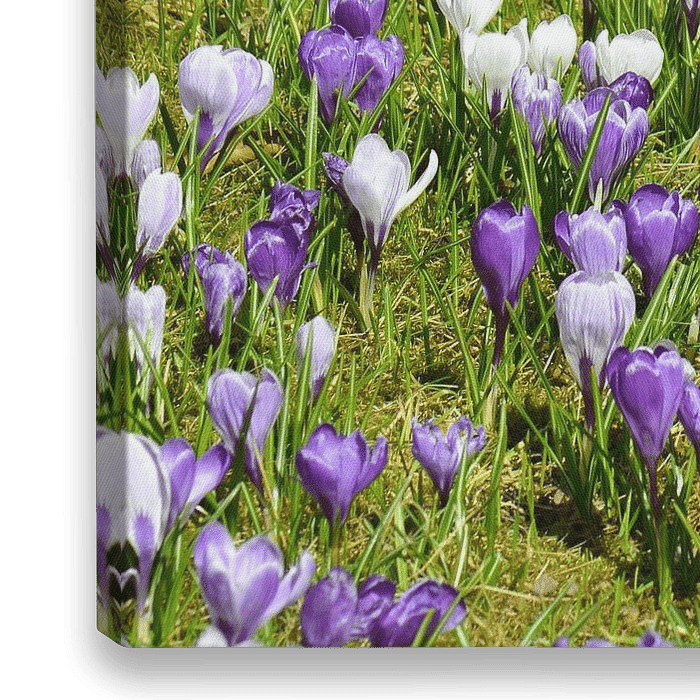Midden in een bloeiende krokusweide staat een eend te genieten van de eerste warme dagen van het jaar. Het heldere groen en de paarse bloemen creëren een levendige, bijna sprookjesachtige lentestemming vol rust en natuurlijke schoonheid.