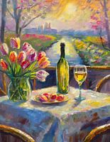 Een schilderij met een tafel die de weelde van het seizoen vastlegt. De vaas met tulpen lijkt te bloeien onder de zachte zonnestralen, terwijl een fles wijn met een bijbehorend glas een uitnodigende sfeer creëert. De kleuren zijn levendig, de schaduwen zacht, en het geheel ademt een rustige lenteschoonheid uit.