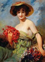 Het model op dit kunstwerk heeft een boeket rode bloemen in de hand. Met de luchtige jurk en hoed op haar hoofd geeft de jonge dame een verleidelijk gevoel van de zomer of warmte in het voorjaar.