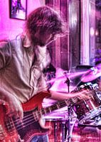 flitsend kroeg optreden van een rock bandje de bassist laat zijn bas loopjes goed horen het swingt de pan uit. de lichtshow doet de rest. een kunstwerk voor aan de muur in HDR stijl .