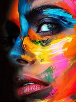 Een vrouwelijk gezicht prijkt tegen een smetteloze zwarte achtergrond, levendig beschilderd met een spectrum van kleuren. Haar expressieve gelaatstrekken vertellen een verhaal van kracht en emotie, terwijl de vloeiende penseelstreken haar persoonlijkheid tot leven brengen op het doek. Haar ogen stralen diepte uit, haar glimlach weerspiegelt vreugde, en elke penseelstreek draagt bij aan de levendigheid van haar aanwezigheid.