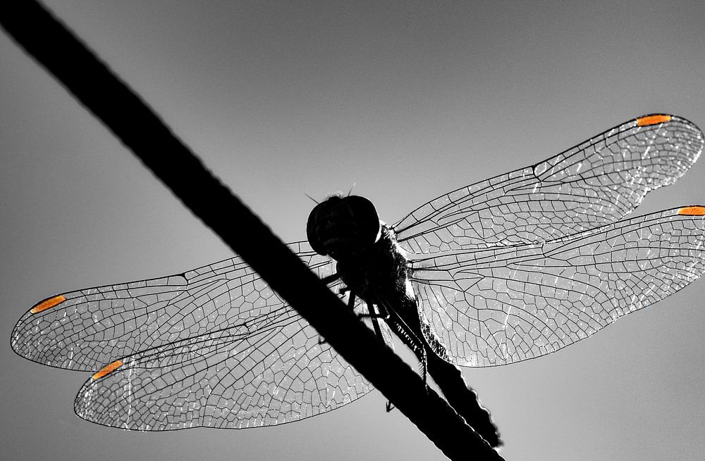 Deze libelle kwam lekker uitgebreid luieren in de zon, waardoor ik gekomen ben tot dit mooie beeld. Om de foto extra bijzonder te maken is hij omgezet naar zwart wit. Maar de natuurlijke oranje details in de vleugels zijn zo gelaten voor een extra mooi accent!