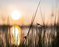 close up van een libel op een grassprietje op de Hatertse en Overasseltse vennen, met op de achtergrond de opkomende zon met zijn reflectie over het water