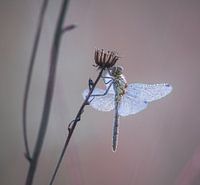 Close up van een libel, op de begroeiing van natuurgebied Tichelgaten in Buren, op de betuwe in Gelderland, waar de vleugels van de libel helemaal bedekt zijn met dauwdruppels.