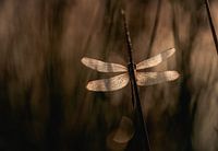 Close up van een libel in het gouden licht van de opkomende zon, de vleugels zijn bedekt met dauwdruppels. De foto is gemaakt bij de Hatertse en Overasseltse vennen.