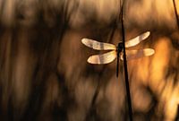 Close up van een libel in het gouden licht van de opkomende zon, de vleugels zijn bedekt met dauwdruppels. De foto is gemaakt bij de Hatertse en Overasseltse vennen.