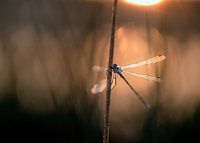 Close up van een gewone pantserjuffer in het gouden licht van de opkomende zon, de vleugels zijn bedekt met dauwdruppels. De foto is gemaakt bij de Hatertse en Overasseltse vennen.