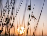 close up van een libel op een grasspriet op de Hatertse en Overasseltse vennen, met op de achtergrond de opkomende zon met de bijgaande prachtige kleuren
