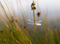 close up van de rug van een libel op een grasspriet op de Hatertse en Overasseltse vennen, waar je een goed detailzicht hebt op de vleugels