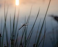 close up van een libel op een grasspriet op de Hatertse en Overasseltse vennen, met de reflectie van de opkomende zon op de achtergrond