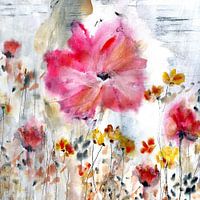 Bloemenschilderij met klaprozen in aquarelverf en grafische elementen. Een kleurrijk en expressief bloemenbeeld voor in de woonkamer. Het straalt optimisme en vrolijkheid uit. De schoonheid van de natuur is altijd een onuitputtelijke bron van inspiratie. Bloemenfantasieën zijn kunstig geënsceneerd. Perfect voor een liefhebber van romantiek.