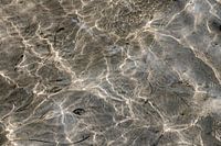 Door een laagje helder water is de zandbodem te zien met hier en daar een blaadje. Lichtstrepen maken een mooie, grillige patronen op het wateroppervlak.
