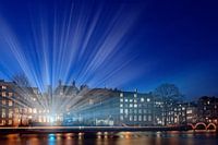 lichtstralen langs de Amstel met de typische grachtenpanden; Amsterdam, Nederland