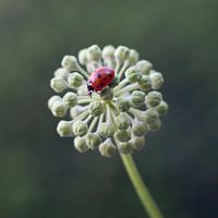 groene achtergrond met een rood beestje met zwarte kevertje met stippen