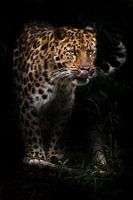 Koop de foto likt zijn lippen in het donker Afrikaans roofdier half uitgespreide poten staart half duister van Michael Semenov op canvas, aluminium dibond, (ingelijste) fotoprint, behang en ArtFrame, op maat geprint in Fine-Art kwaliteit.