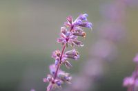 close up van een lila herfstbloem met een zachte grijs groene achtergrond