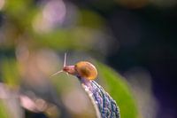 close up van een huisjesslak die op het uiterste puntje van een blad zit, met een zonnige bokeh achtergrond