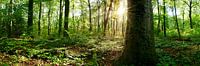 loofbos met grote beukenbomen op de voorgrond en ochtendzon op de achtergrond