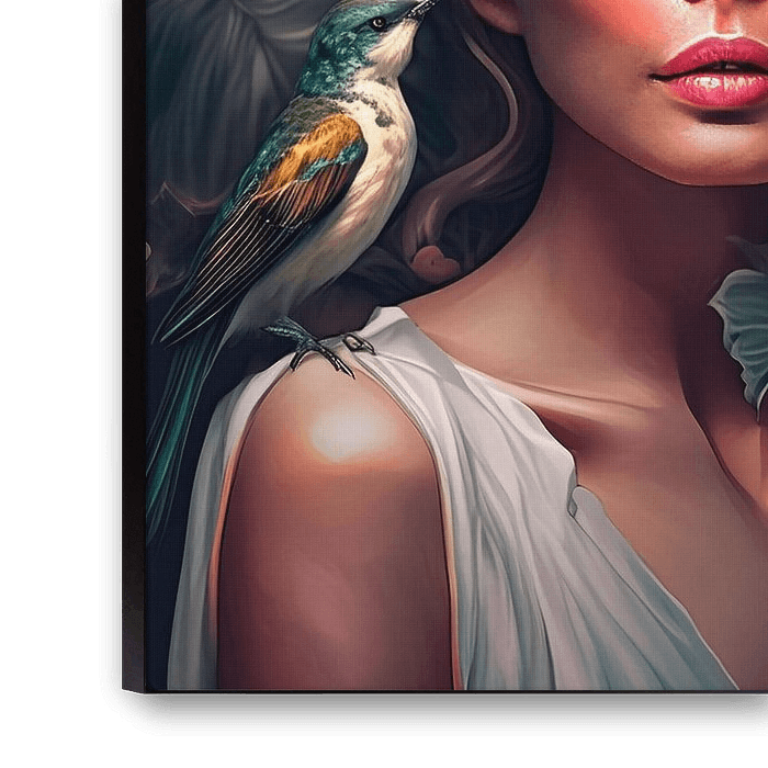 Een kleurrijk protret van een geblinddoekte vrouw, Versierd met tropische bladeren, pioenrozen en droogbloemen. Dit werk heeft een zachter romantische uitstraling, maar benadrukt de schoonheind en vooral de kracht van elke vrouw. Soms hebben we de behoefte om even in ons zelf te keren en te dromen van een prachtige omgeving. Vol mooie bloemen en geurende grassen. In een warme prettige omgeving weer opladen voor een nieuwe dag vol chaos en hektiek.