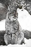 Koop de foto lynx van de stad zit verticaal in de sneeuw en kijkt toegeeflijk met grote heldere ogen naar anderen van Michael Semenov als print op canvas, aluminium dibond, (ingelijste) fotoprint, behang en ArtFrame. Voor jou op maat geprint in Fine-Art kwaliteit.