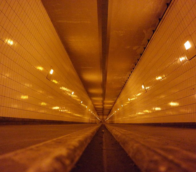 het oranje licht is kenmerkend voor de maastunnel uit rotterdam. de foto is laag bij de grond genomen, zodat het lijnenspel nog mooier uitkomt