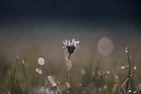 jong madeliefje in het grasveld, wat vochtig is door dauwdruppels, die glinsteren in de ochtendzon
