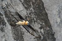 Gypaetus barbatus / Bartgeier / Laemmergeier / bearded vulture flying in front of a steep cliff / slope.
