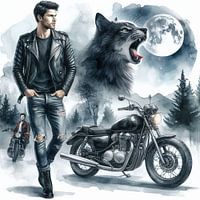 Wat een bijzondere beelden, een man met een motor en een wolf, kat of beer in maanlicht stoer en toch kwetsbaar, door de bijzondere compositie lijkt het een collage en toch is het ook 1 geheel. in het maanlicht zie je een man met een motor en een wolf, kat of beer. sexy, stoer, kwetsbaar, lief, vertederend. allemaal woorden die passen…