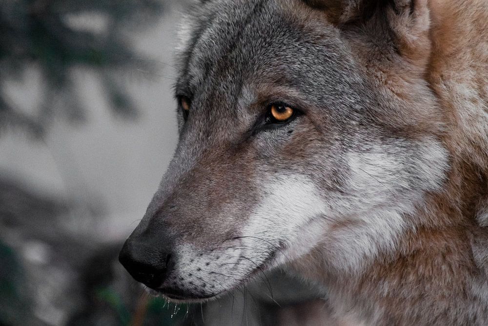 mannelijke zwarte wolfskop close-up, brandende lichtgevende ogen.