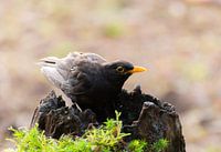 close up van een mannetjes merel op een dood stuk hout in het bos