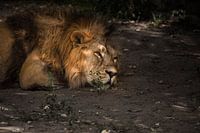 mannelijke leeuw met een krachtige manen slaapt in de struiken van een donker bos in de hitte...