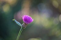 close up van een Mantisalca salmantica, een fuchsia roze zomerbloeier, met een bokeh groene achtergrond