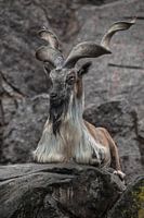 markhor geit zit op de achtergrond van een rots, lange gedraaide horens, dieren van pakistan