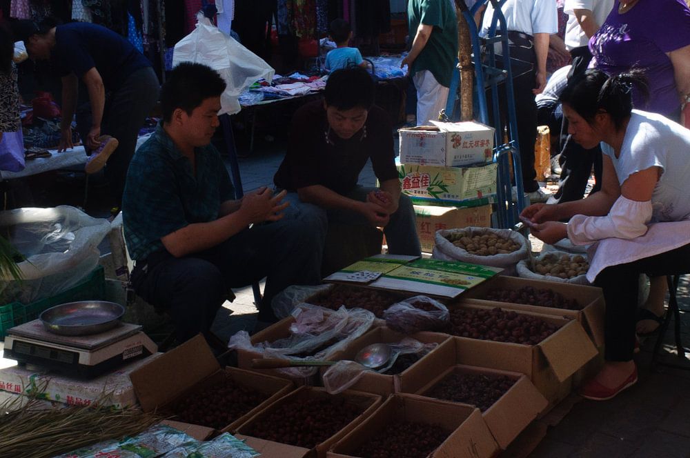Markt in een wijk in Beijning Deze markt word dagelijks gehouden Je kunt er van Fruit tot 2e hands kleding krijgen. Dezemarktlui waren aan het gokken
