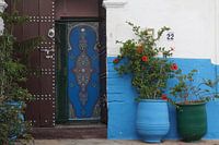 Mooi blauw, de kleur in de straatjes van Fes in Marokko. Een mooi versierde deur met bloemen ernaast.