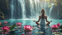 digitale spirituele schilderachtige afbeelding van fictieve mediterende vrouw met lotusbloemen en water