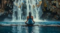 digitale spirituele schilderachtige afbeelding van fictieve mediterende vrouw bij waterval met geesten