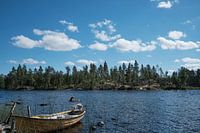 Meer in zweden met blauwe lucht en witte wolken met een roeiboot op de voorgrond en dennen bomen en een klein huis in de achtergrond