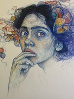 Dit kunstwerk is een intrigerend portret met een diep psychologische lading, uitgevoerd in een kleurrijke, losse lijnstijl. Het beeld toont een jong persoon, wiens intense blik naar de kijker gericht is. De blauwe, roodbruine en gele lijnen zijn met zorg aangebracht, waardoor de gelaatsuitdrukking levendig en gedetailleerd overkomt. De hand die tegen de lippen rust, versterkt de contemplatieve houding van het onderwerp, alsof hij of zij diep in gedachten verzonken is.