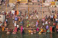 mensen nemen ritueel bad in de rivier de Ganges in de heilige stad Varanasi, India. Het heilige rituele bad wordt elke dag gehouden
