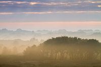 Duingebied Berkheide, Katwijk, Nederland. Duinen in het voorjaar in de mist. Zonsopkomst met wolken en mist boven de duinen. Zonnestralen door het wolkendek (jacobsladder).