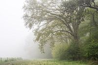 landschap in Renkum, Gelderland, waar de mist op een koude lenteochtend onder de grote bomen hangt