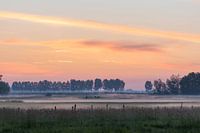 landschap in het blauwe uurtje voor de zonsopkomst, waar de lucht al mooi oranje kleurt en de nevel over het weiland hangt