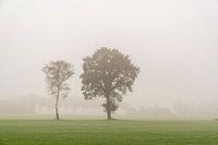 De bomen staan alleen in het landschap. Op deze mistige dag is het nog meer duidelijk. Mystiek landschap. Mooi stil landschap. Aan de rand van het weiland staan nog meer bomen, In de herfst maakt de natuur zich klaar voor de koude dagen.