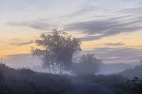 wandelpad op de Overasseltse en Hatertse vennen, vroeg in de ochtend, met nevel over de grond en de bijna opkomende zon
