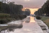 rivier de Linge waar vroeg in de ochtend de nevel over hangt, en de lucht stilaan oranje kleurt door de zonsopkomst