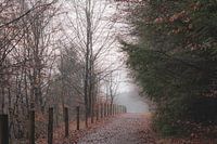 landschap met een wandelpad op natuurgebied Kwintelooijen in Rhenen, Utrecht, tijdens een mistige herfstochtend