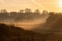 zicht over het mistige landschap in Heteren, waar de stralen van de opkomende zon over het gras schijnen