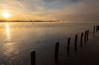 mistige zonsopkomst over het water met reflecterende palen en pastel kleuren. De Pietersplas in Maastricht is tijdens de wintermaanden een unieke locatie voor unieke zonsopgangen