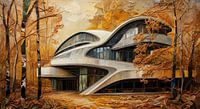 een hypermodern gebouw in de stijl van het deconstructivisme staat in een herfstbos